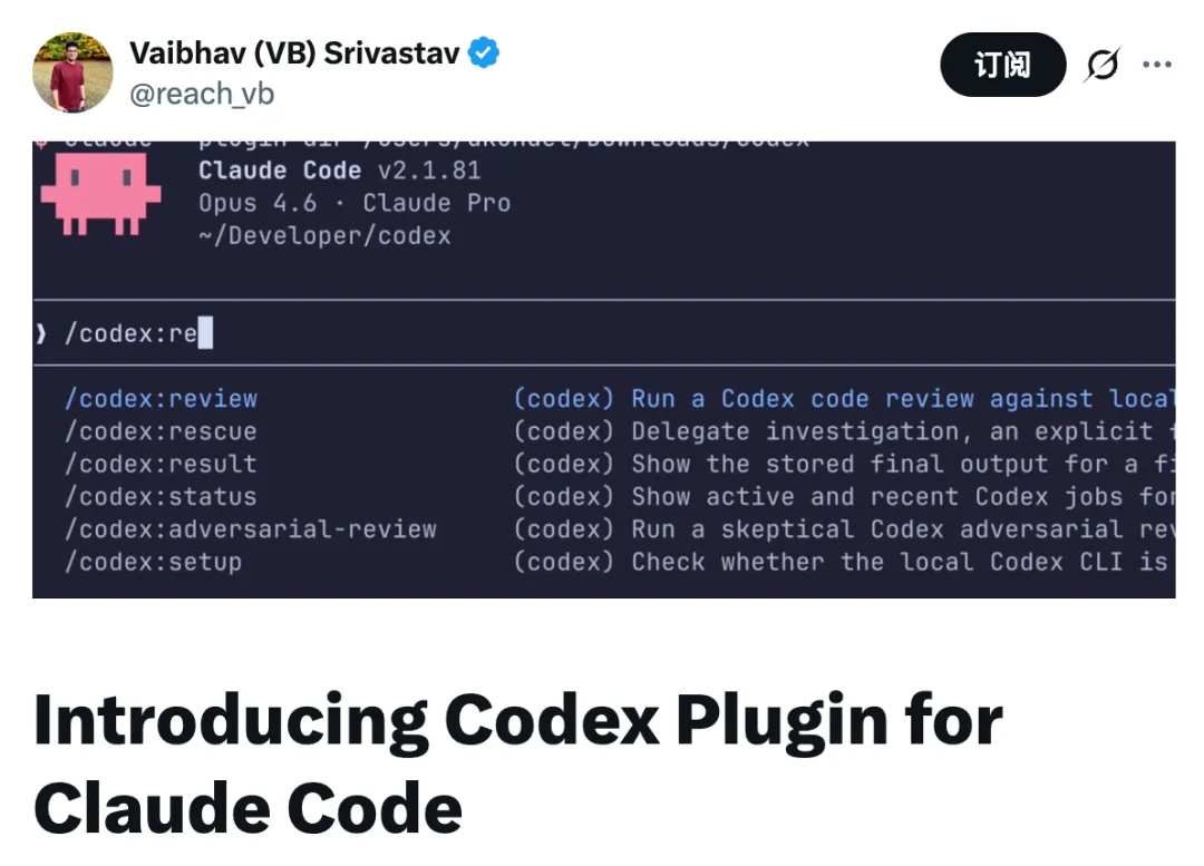 OpenAI发布Codex Plugin for Claude Code,让 Claude Code 用户在同一工作流中无缝调用 OpenAI Codex 的插件。