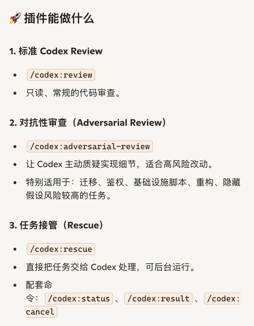 目标是提供第二视角的代码审查、对抗性审查,以及在需要时把任务直接交给 Codex。