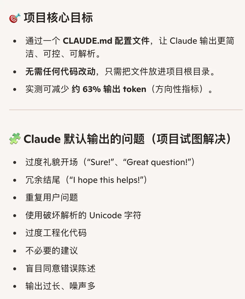 社区项目claude-token-efficient通过一份配置文件减少Claude的冗余输出(示例中可节省约63%输出词量)。