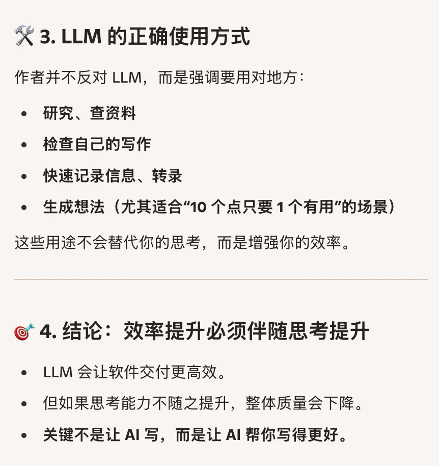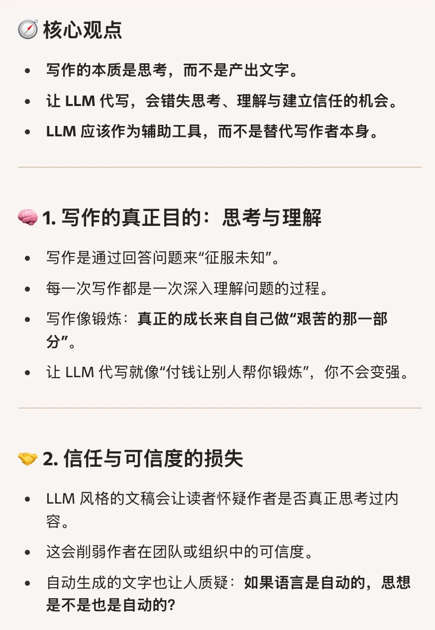 让AI代写会削弱个人思考与信任构建,但写作本身是思考的过程,亲自写作有助于理解与建立信誉。