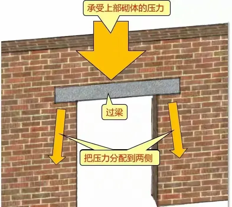 过梁:没有过梁,门窗上方的墙体重量直接压在门窗框上,很容易压坏门窗、导致墙体开裂。
