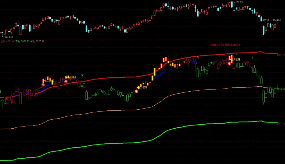 CXH:DRAWTEXT_FIX(1,0.75,0,0,’☆微信公众号:(程序化指标) ☆’),COLORRED;