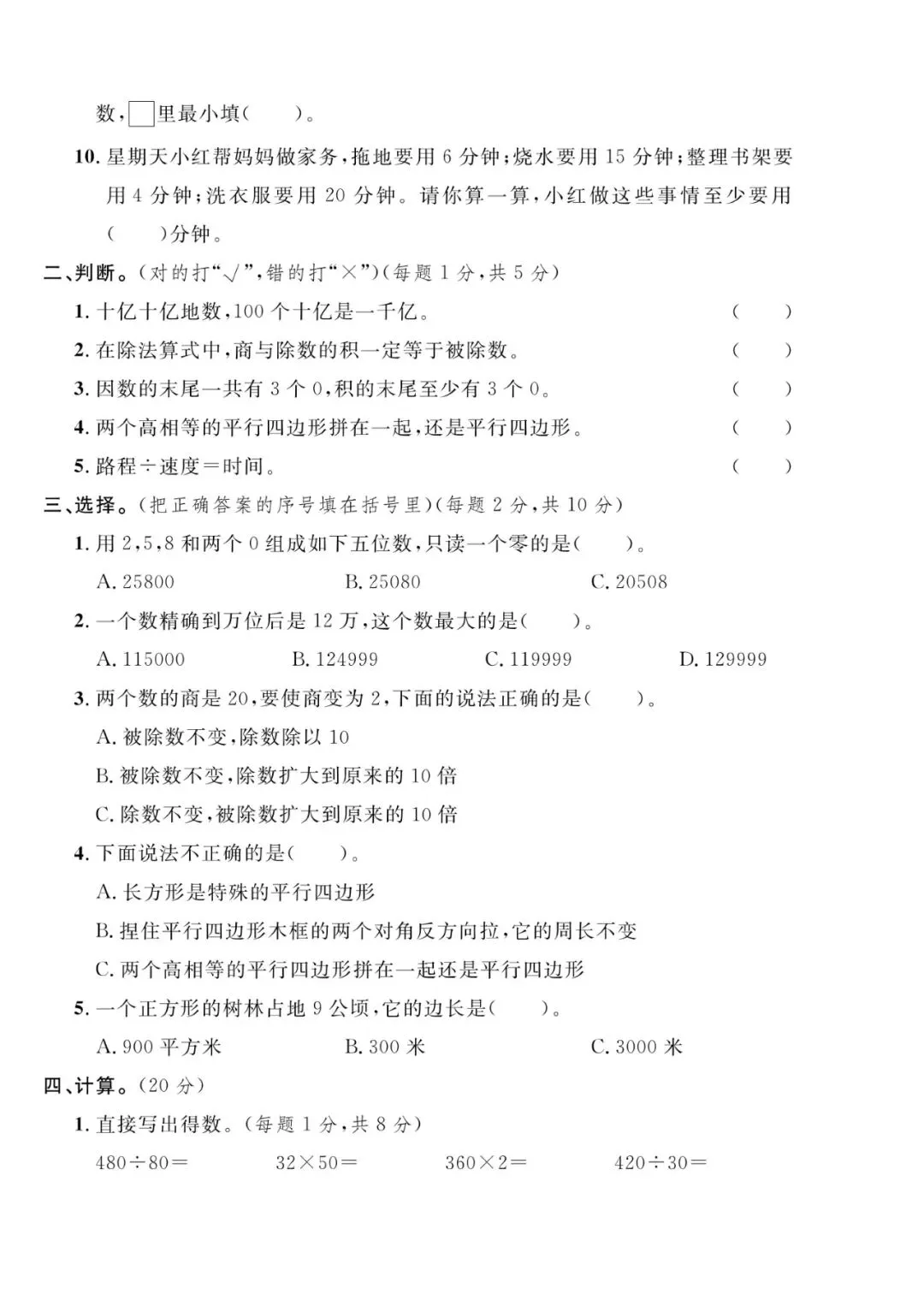 四年级数学下册模拟检测卷【可打印】