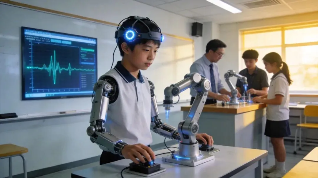 北京一零一中学脑机接口实验室,学生通过专注力操控机械臂书写汉字——实时反馈让“思考过程”变得可见(来源:2026年3月24日《脑机接口实验室进中学》报道)