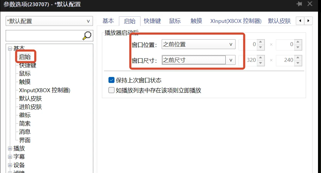 右键 →「选项」→「基本」→「启始」→ 窗口位置「之前位置」,窗口尺寸「之前尺寸」