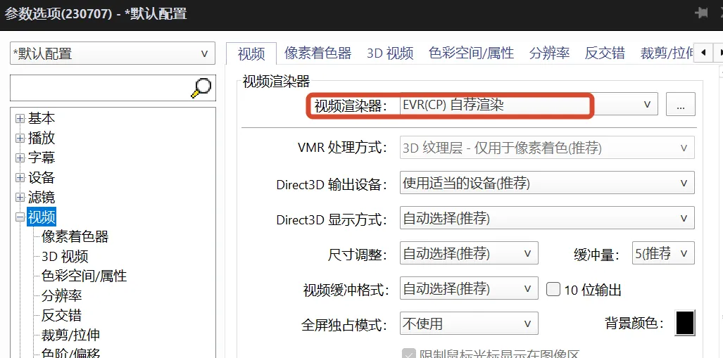 右键 →「选项」→「视频」→ 渲染器选 EVR (CP)(兼容性比较好)