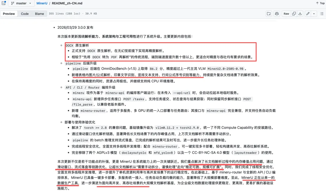 mineru(https://github.com/opendatalab/MinerU/blob/master/README_zh-CN.md)是当前很火热且较为推荐的文档解析组件,但这个方向其实已经卷的差异性没那么大了,可以根据其更新日志来看看这个方向的趋势,总结的看有如下几个点: