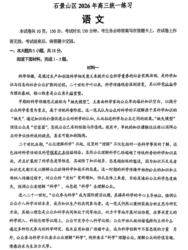 小编整理了2026年北京石景山高三一模语文,PDF版!可以参考练习。