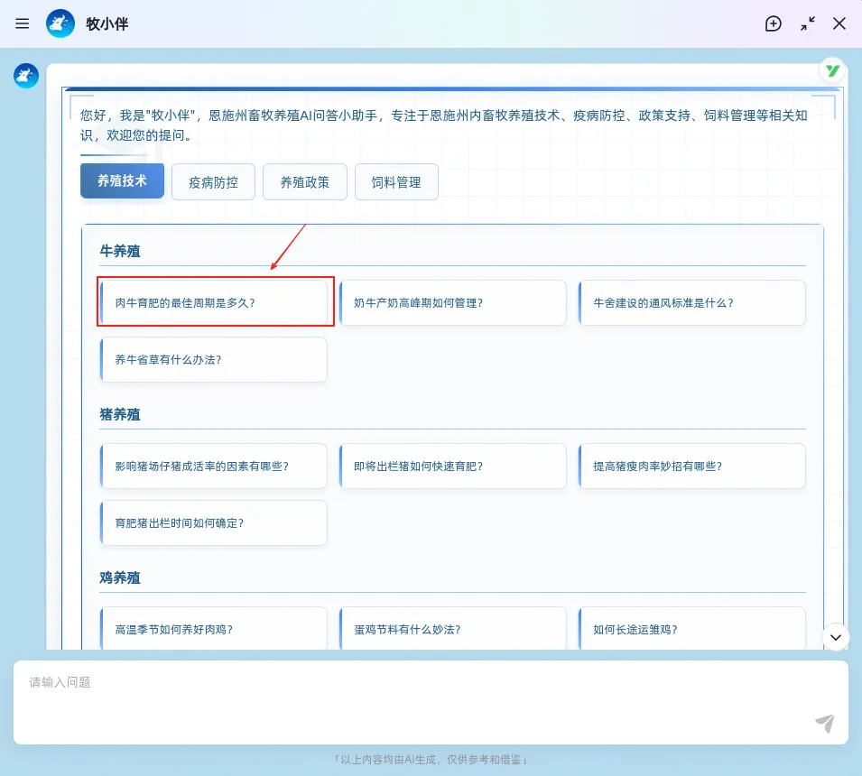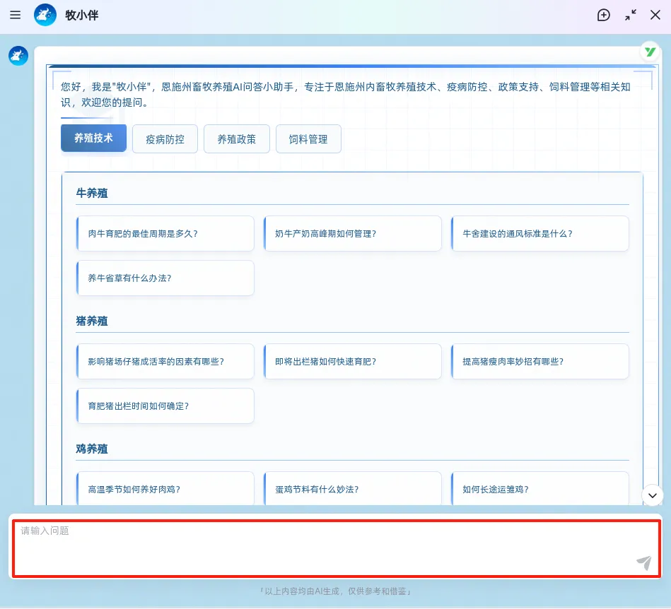 近日,恩施州畜牧兽医服务中心官网正式上线“牧小伴”智慧畜牧养殖AI助手,用户进入官网即可使用,该助手可为全州养殖户提供全天候智能服务。
