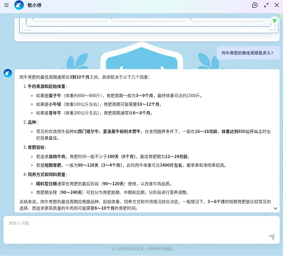 “牧小伴”聚焦养殖生产实际需求,设置四大核心功能板块:一是养殖技术服务,提供牛、猪、鸡养殖指导及先进模式推介;二是疫病防控指导,涵盖常见疫病识别与防疫管理指导;三是养殖政策查询,可查询养殖补贴、防疫支持等政策;四是饲料管理指导,提供饲料选择与科学管理建议。