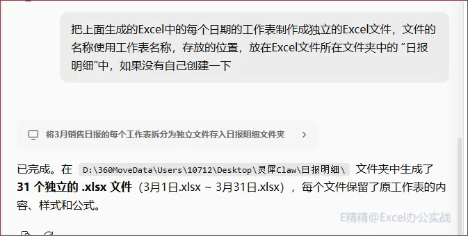 直接接着上面的问题,往下继续问的,所以直接说上面生成的那个Excel文件,大模型这些还是可以理解的,然后具体的需求,把生成的工作表处理独立的Excel文件,放在特定的文件夹,注意这个文件夹我是没有创建的,我提醒他如果没有创建,他自己创建一下,旁边是结果是完全OK!