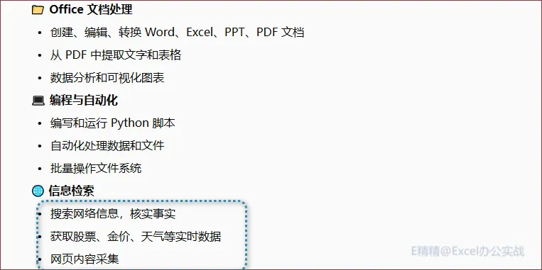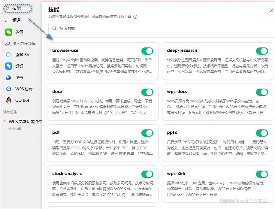 第一个就是技能,也就是大家听的比较多的SKILL,自带了一些主要还是办公常用的WPS、pdf、PPT、Excel及浏览器操作等,主要还是按定位办公自动化来内置的!可惜的是目前没有办法添加第三方和个人的SKILL!