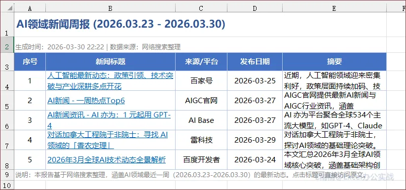 先看一下整理的结果,看上去不错吧,格式做了,第二列也添加了超链接,可以直接查看新闻的原文,来源、发布日期和摘要都有!说实话,基本符合我的预期结果!