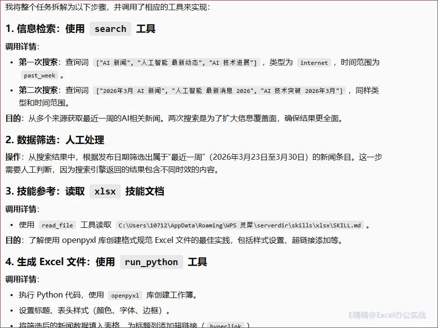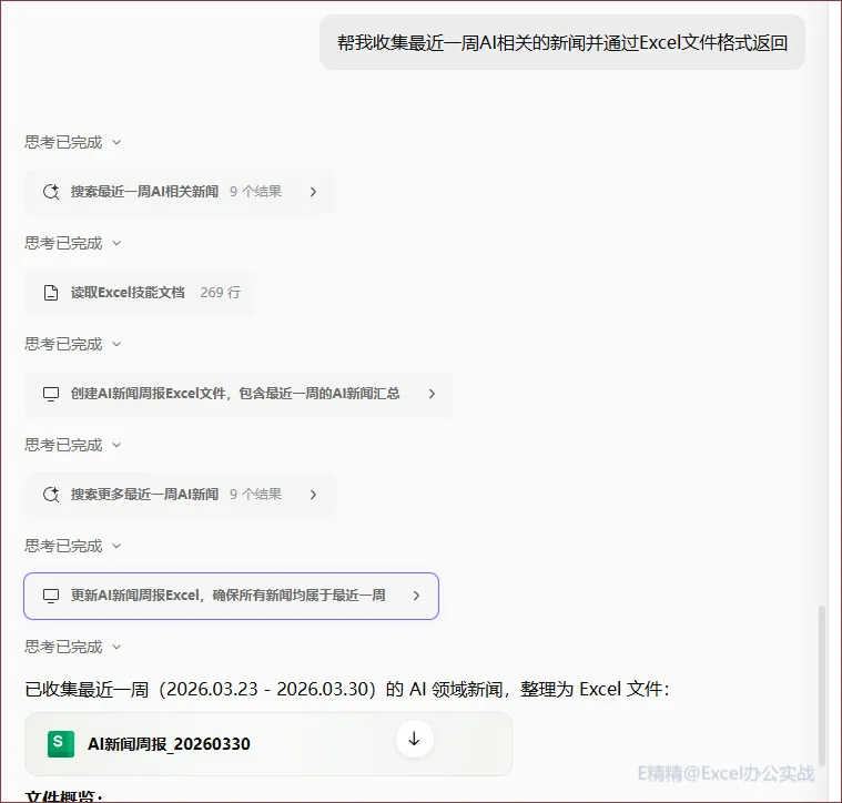 先看我们的需求,我比较关注AI发现,我就简单的讲了一下,让他收集一下最近一周AI新闻并用Excel文件格式返回!
