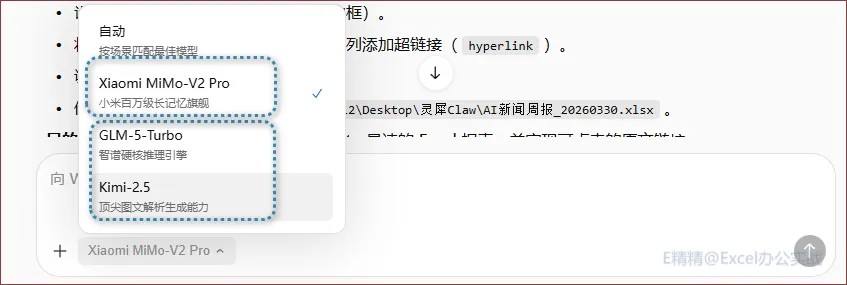 第二个:AI大模型,目前自带的是GLM-5,还是不错的模型,尤其编程能力基本国内也是排在前面的!Kimi的长文本能力也是没的说,还加入了小米自研的最新模型Xiaomi MiMo-V2-Pro