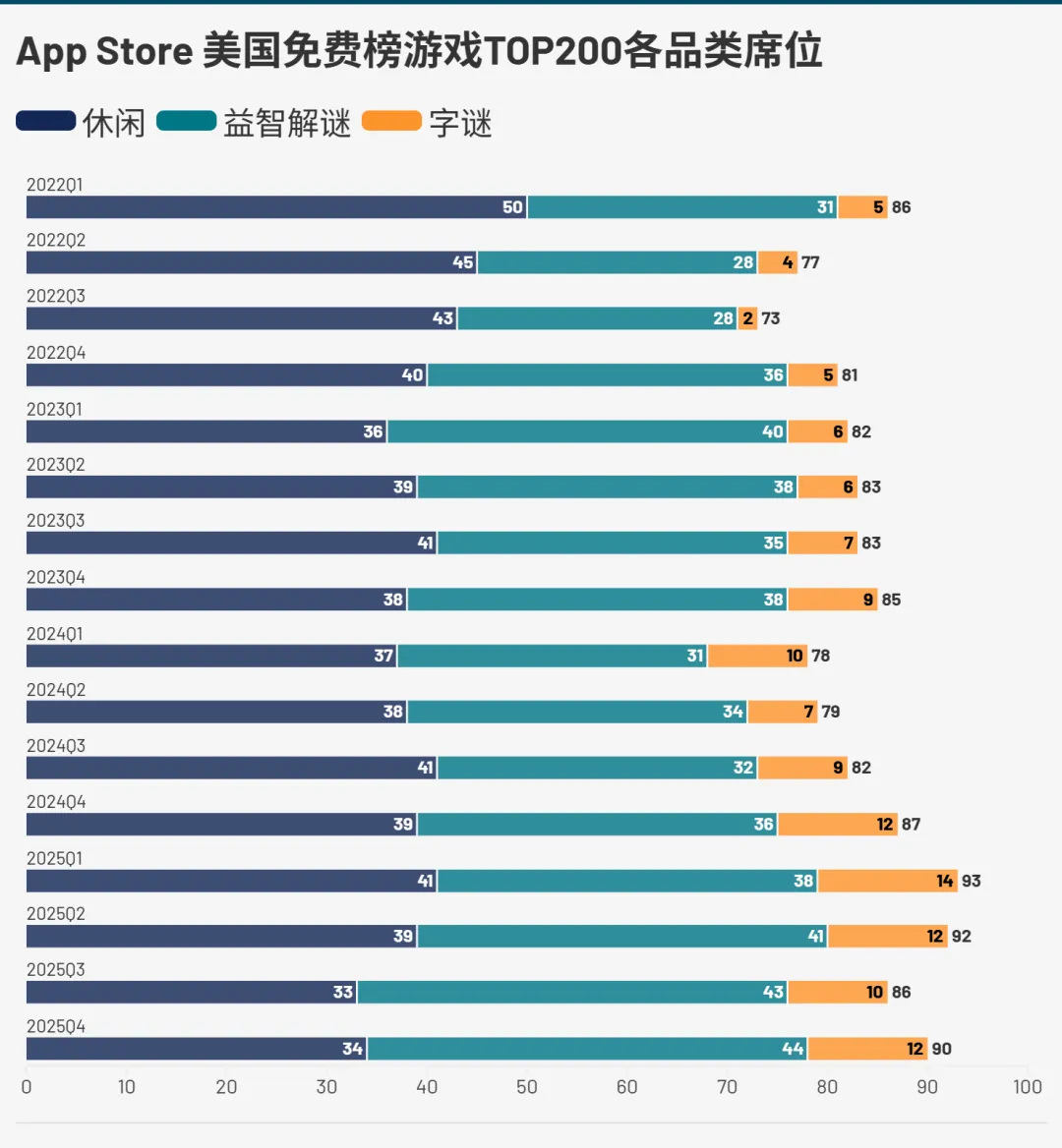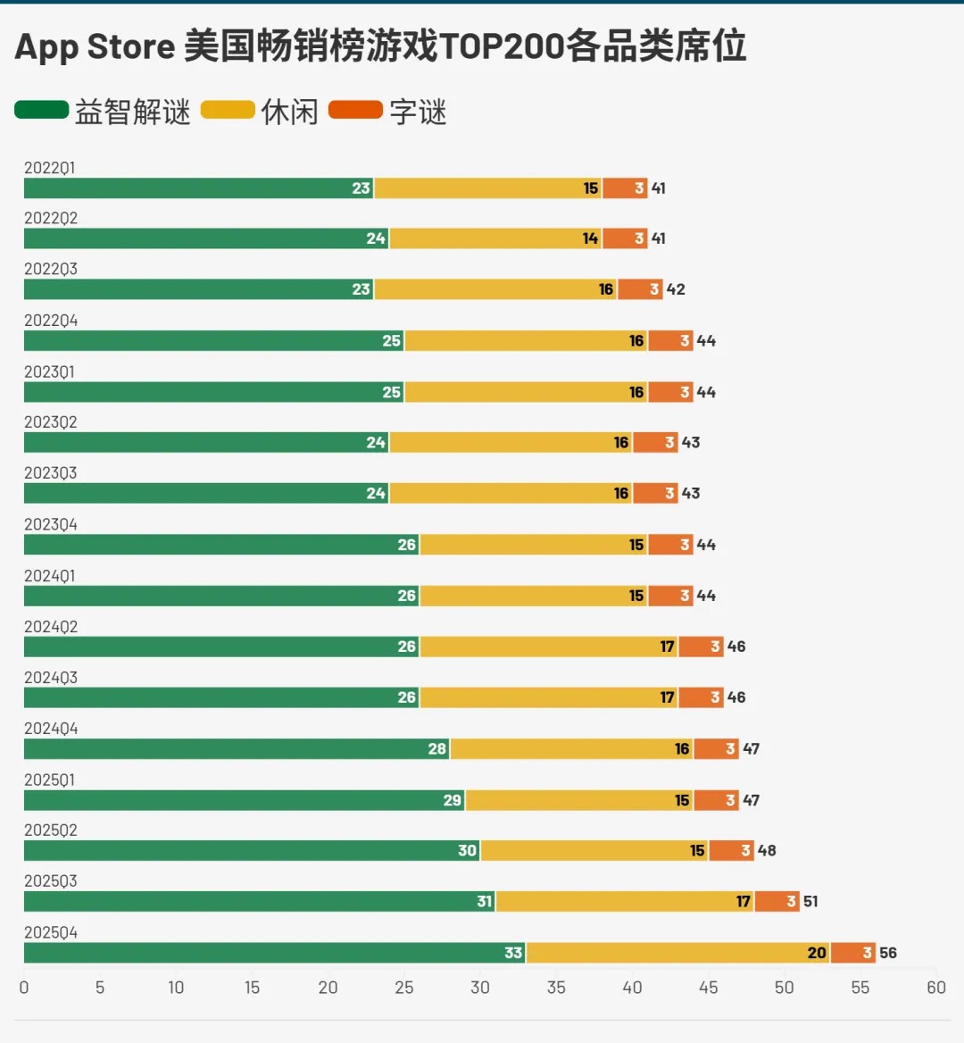 第一篇选的是iOS游戏生态中体量最大的三个轻度品类:益智解谜、休闲、字谜。三者合计在AS免费榜上占约90个席位、畅销榜约57个席位、双榜产品32个——是iOS游戏生态的绝对主力,这个类型也是我个人最看好的赛道,跟谷歌榜单的判断一样,丰俭由人,包罗万象。