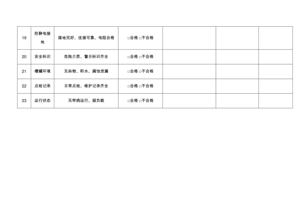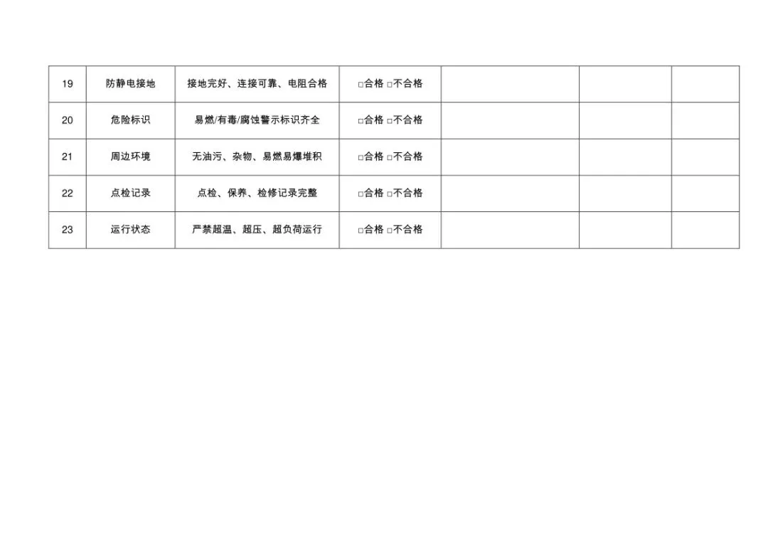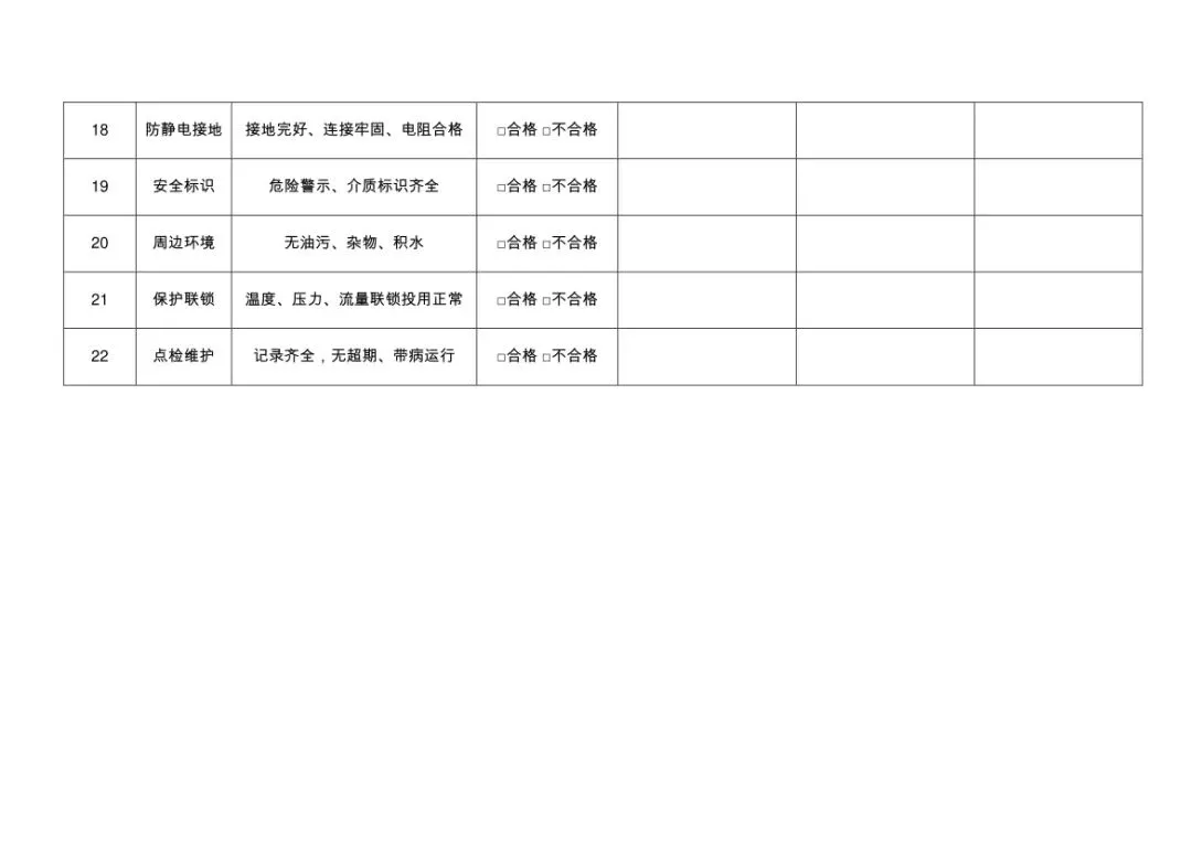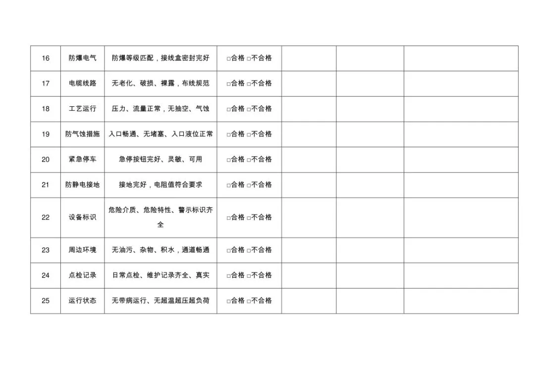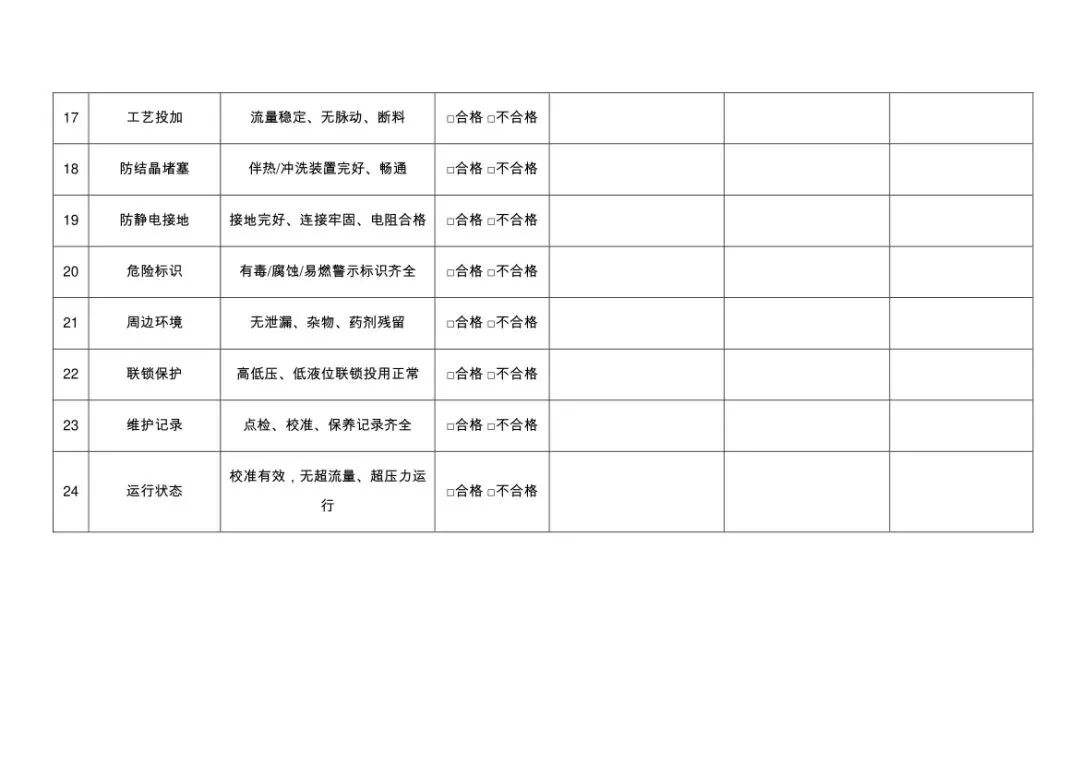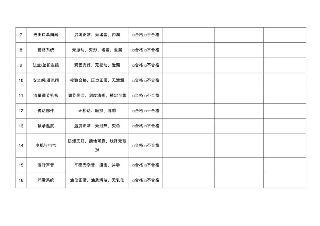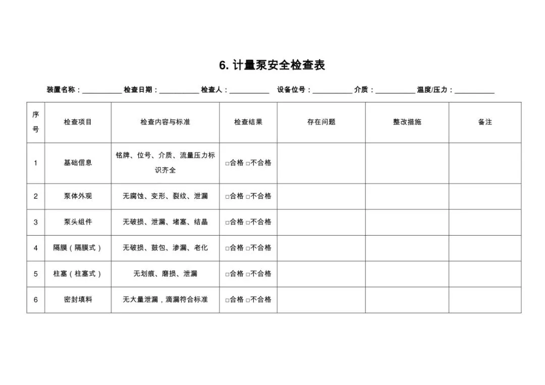 齿轮泵、液下泵、计量泵的检查清单同样各有侧重,齿轮泵增加安全阀、泄压回路的检查项,液下泵关注液下部分防腐、液位联锁等内容,计量泵则针对泵头组件、隔膜/柱塞、流量调节机构等计量关键部件提出检查标准,同时覆盖防结晶堵塞、联锁保护等特殊要求。6类清单均包含基础信息、设备本体、管路连接、电气系统、工艺运行、安全防护、周边环境、记录管理等通用维度,确保检查无死角。