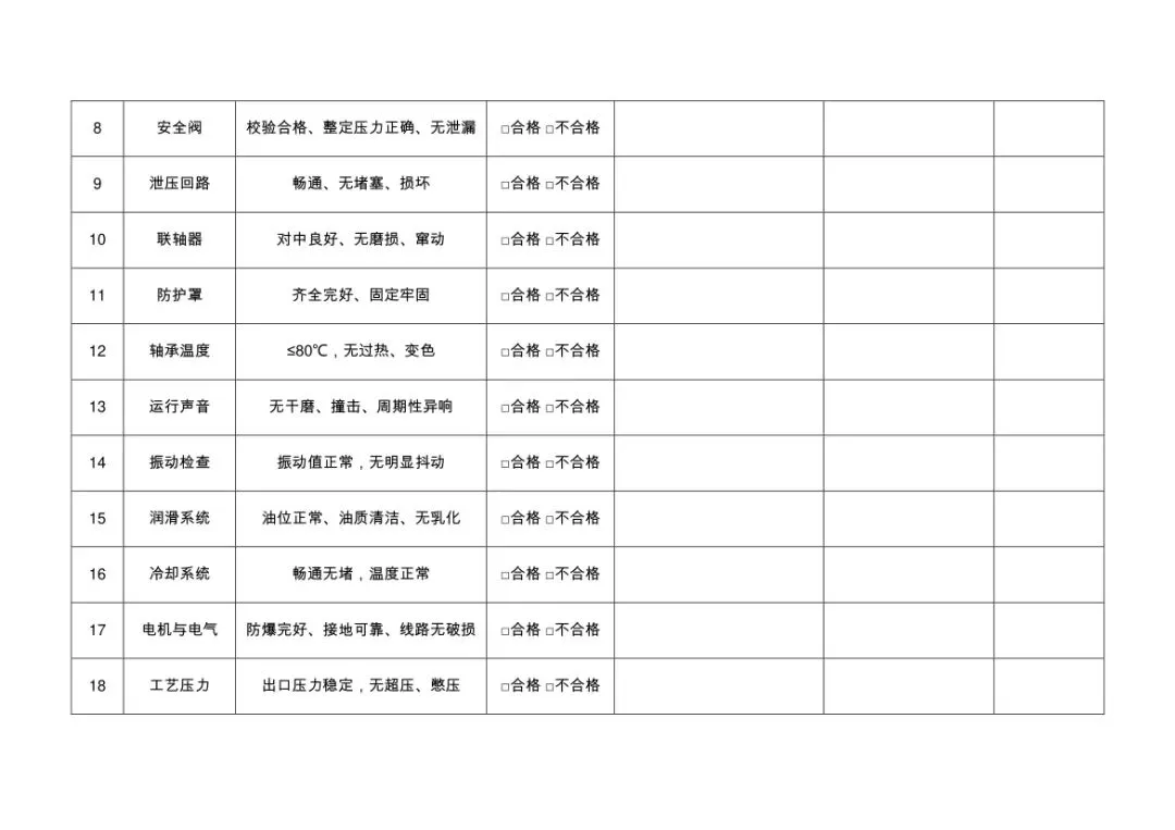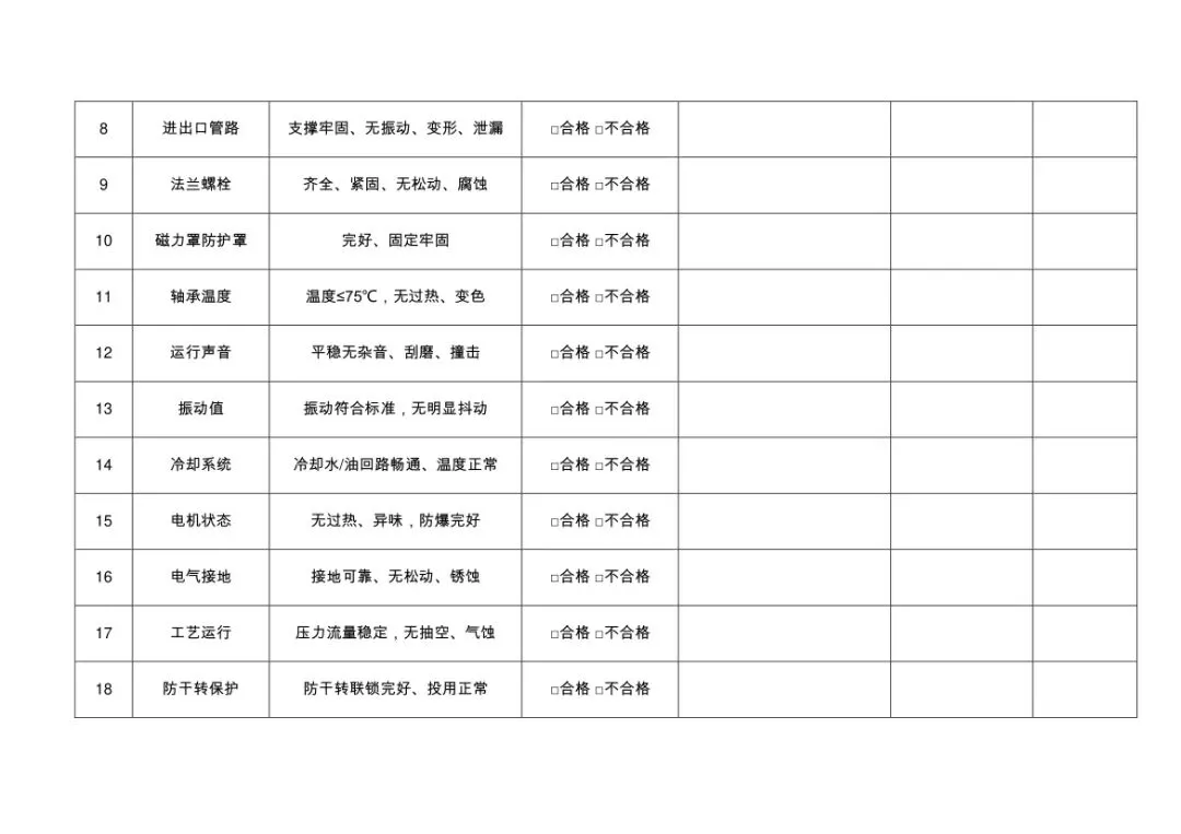 这份检查手册针对6类泵的设备特性,分别制定了专属检查清单,每类清单均明确检查项目、内容与标准,同时预留检查结果、存在问题、整改措施等填写栏,兼顾实用性与规范性。离心泵检查围绕泵体壳体、密封系统、润滑冷却、电气防爆等25项核心内容展开,对轴承温度、振动值等关键参数标注清晰标准;屏蔽泵重点关注屏蔽套、定子腔、轴承系统等专属部件,同时核查各类保护联锁的投用状态;磁力泵则针对磁力耦合器、隔离套等核心组件制定检查要求,明确轴承温度等控制指标。