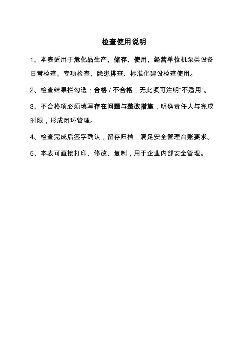 手册还附上详细的检查使用说明,明确检查结果填写规范、不合格项整改要求、台账留存等事项,指导从业者形成检查-整改-归档的闭环管理。无论是日常设备点检,还是专项隐患排查、标准化达标检查,这份手册都能作为实用参考,帮助工作人员快速掌握各类泵的检查要点,精准识别设备隐患。