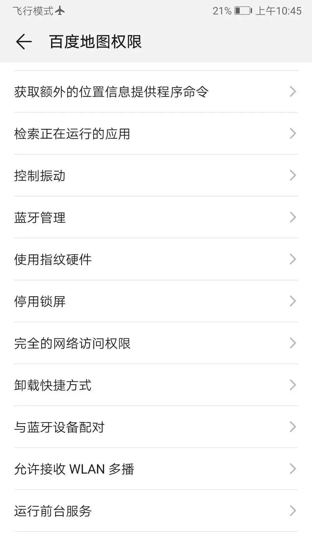 但在进入权限管理页面中的“查看所有权限”后,你还能查看到百度地图使用权限的更多细节,诸如读取应用市场的配置信息、检索正在运行的应用、直接下载文件而不显示通知等。