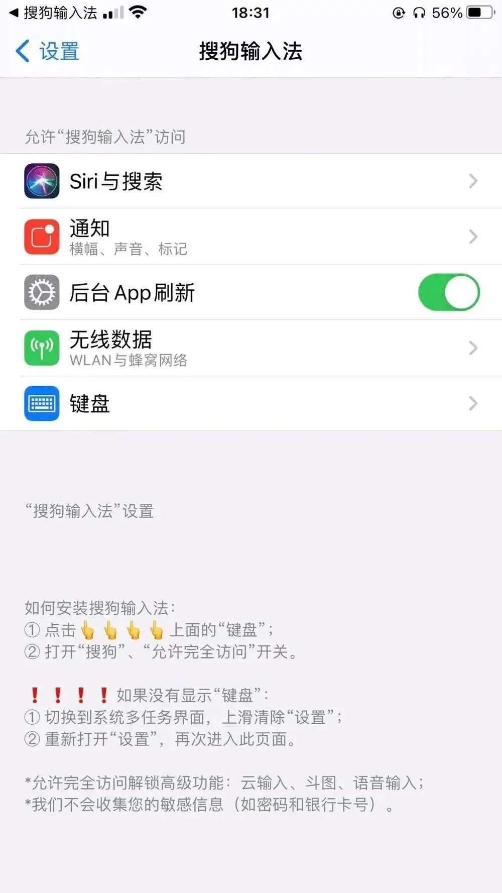同样,搜狗输入法在iOS端的权限需求也大大收缩,它在苹果手机上的权限仅包括Siri与搜索、通知、后台APP刷新、无线数据以及键盘等5项。