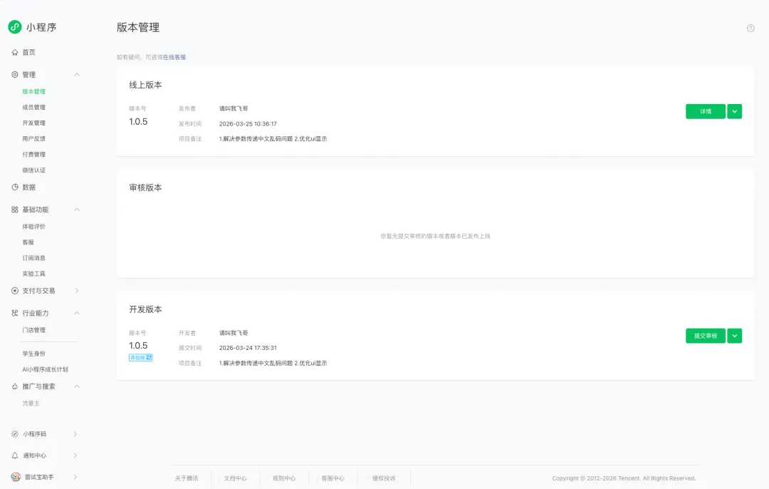 登录 微信公众平台 → 开发管理 → 提交审核 → 发布