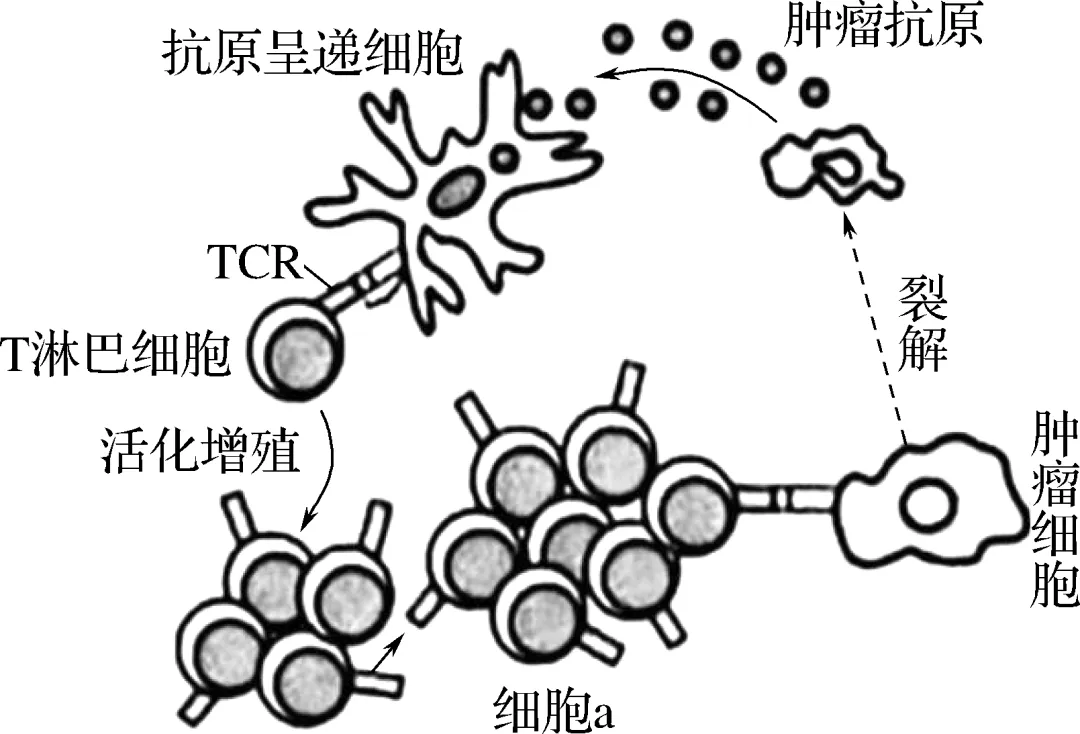 【解析】T淋巴细胞活化增殖为细胞a(细胞毒性T细胞)和记忆T细胞,细胞a的遗传物质不会发生改变,A错误,B正确;免疫系统识别和清除肿瘤细胞的过程体现了免疫监视功能,C错误;图中肿瘤细胞的死亡属于细胞凋亡,是由基因所决定的程序性死亡,D错误。