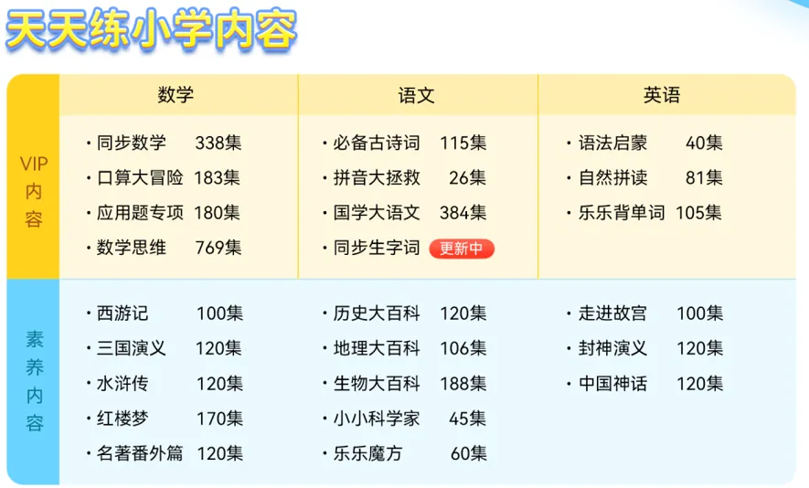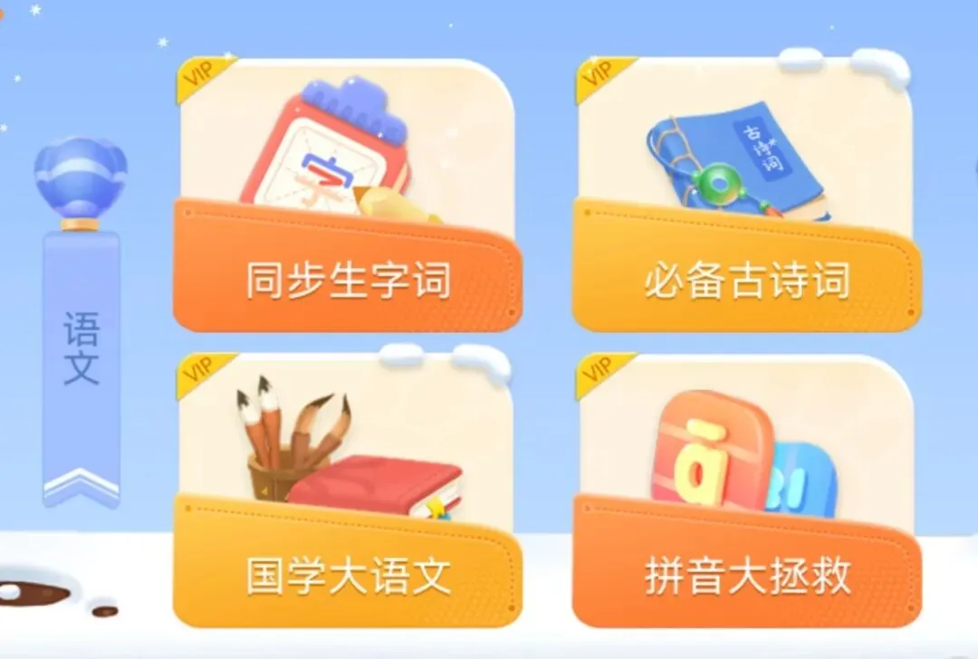 课内主要包含:国学大语文培养文学素养,必备古诗词和课本同步的诗词鉴赏,同步生字词匹配部编部小学语文教材,讲解每个单元的生字词;拼音大拯救系统帮助孩子过拼音关打好基础。