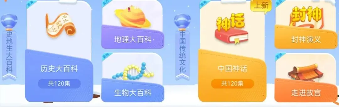历史大百科(120集)、地理大百科(106集)、生物大百科(188集)