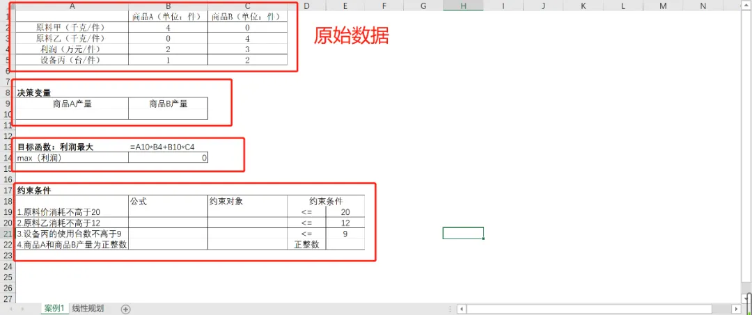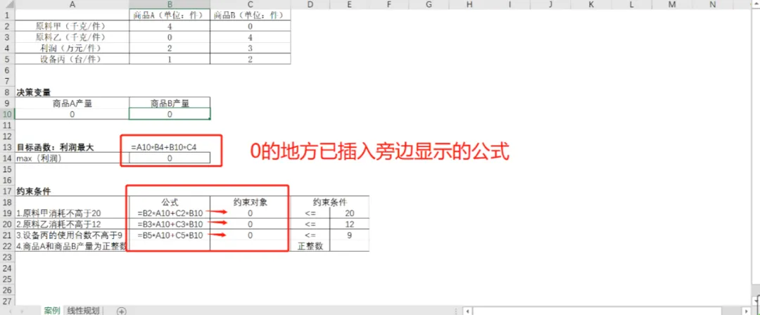 首先整理一下数据,原始数据和三要素。将题目数据整理成如下区域,并设置公式。这些公式都是用于计算值所设定的,例如:利润,就是用A、B两个商品的产量和利润的乘机和求得的。由于产量里面还没有数,所以目前插入公式后显示的结果都为0。