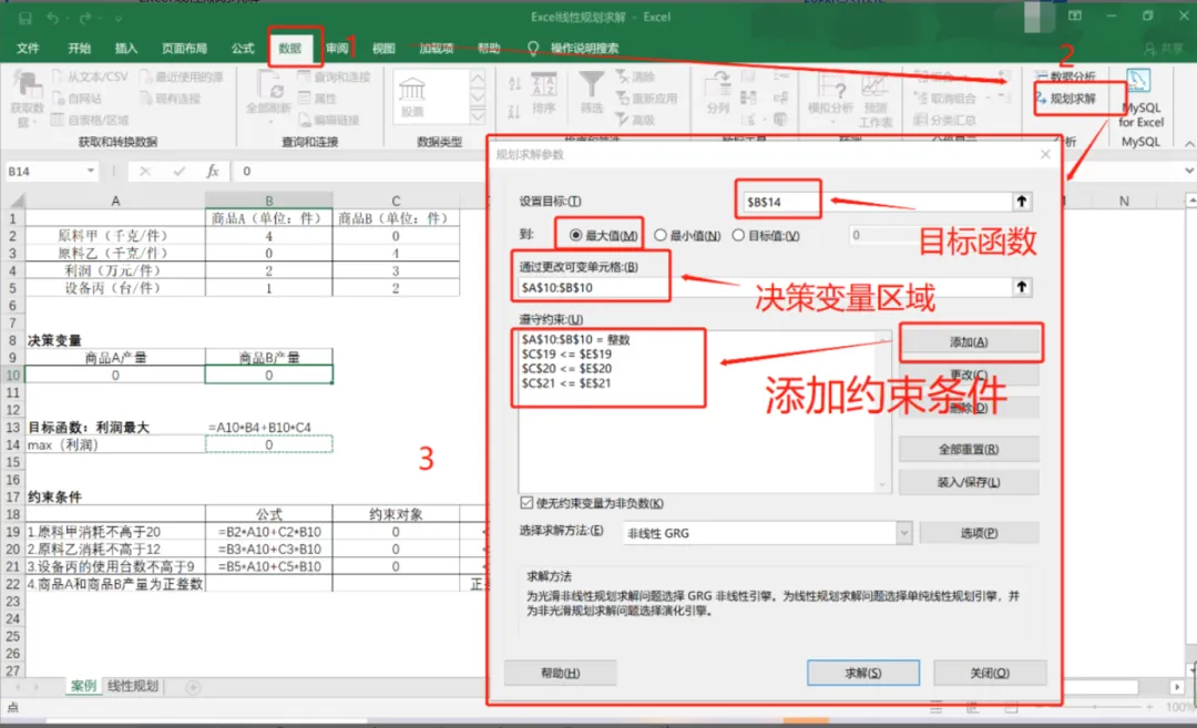 设置目标:选中目标函数单元格(如利润)。