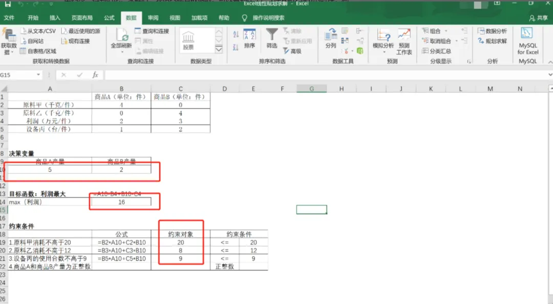 点击求解后,系统会自动算出最优产量。例如:生产 5件A 和 2件B 时,利润最大为 16,且所有资源消耗均未超标。