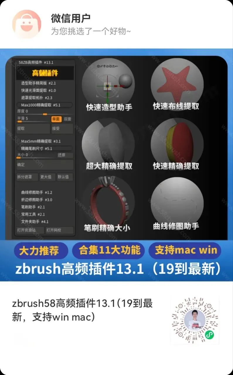 zbrush58高频插件更新13.1,兼容2019到到2026版本更高版本 (1)免费学习解答分享(周老师微信15767872372) 高频插件已经更新 (2)zbrush学习群全部免费|进群+雕刻资料) (3)付费课程了解ZBrush雕刻系列付费课程!