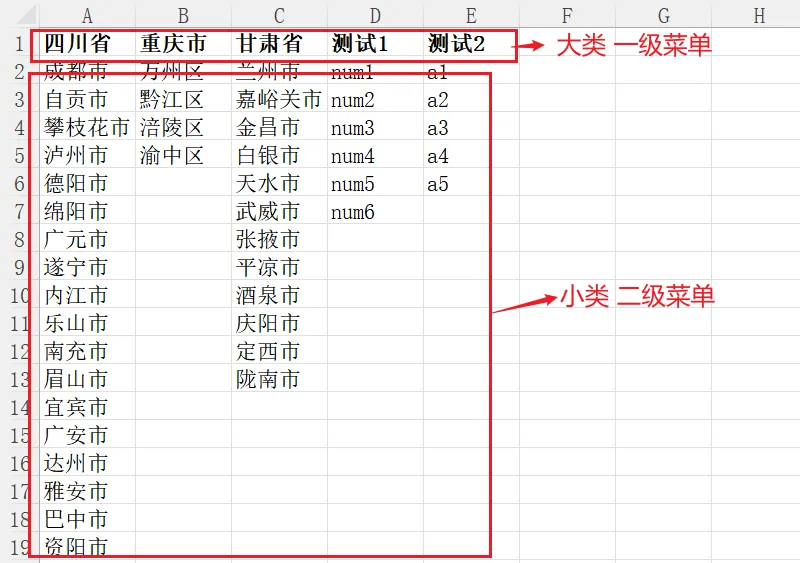 首先,准备源数据,分清楚一级菜单和二级菜单内容,如省份为一级菜单,各省份下的市州为二级菜单。