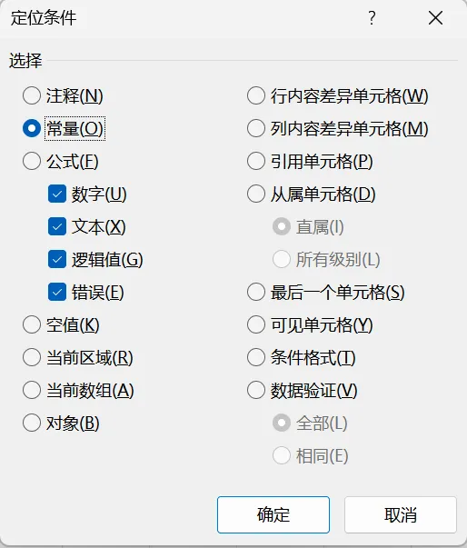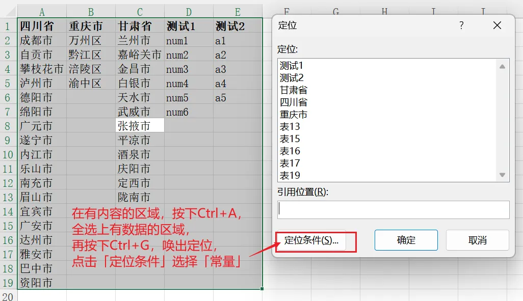 然后在有内容的区域,按下「Ctrl+A」全选上有数据的区域,再按下「Ctrl+G」,唤出定位,选择「定位条件」下的「常量」。
