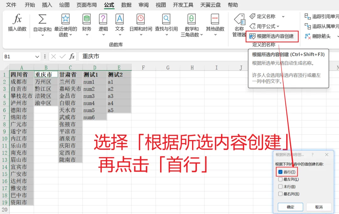 再点击「根据所选做内容创建」,勾选上「首行」,如下。