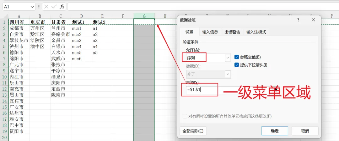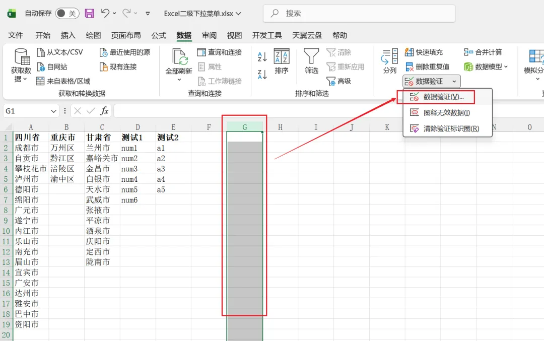🎯制作一级菜单:选中某一列,如下图G列为一级菜单,选择「数据→数据验证」。