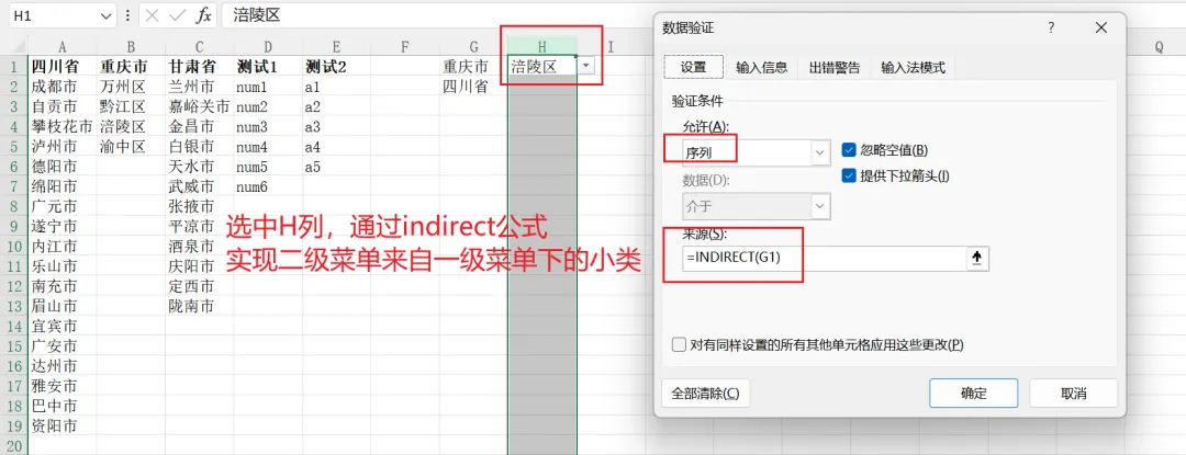 🎯制作二级菜单:选中H列,点击「数据验证」,通过「indirect」公式,实现二级菜单和一级菜单关联,如下。