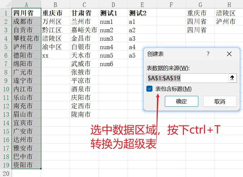 选中数据区域,按下「Ctrl+T」,勾选上「表包含标题」,点击确定。