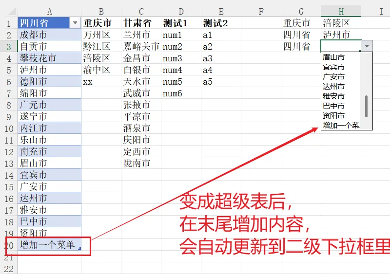 如下,变成超级表后,在末尾增加内容时,二级菜单会自动更新。