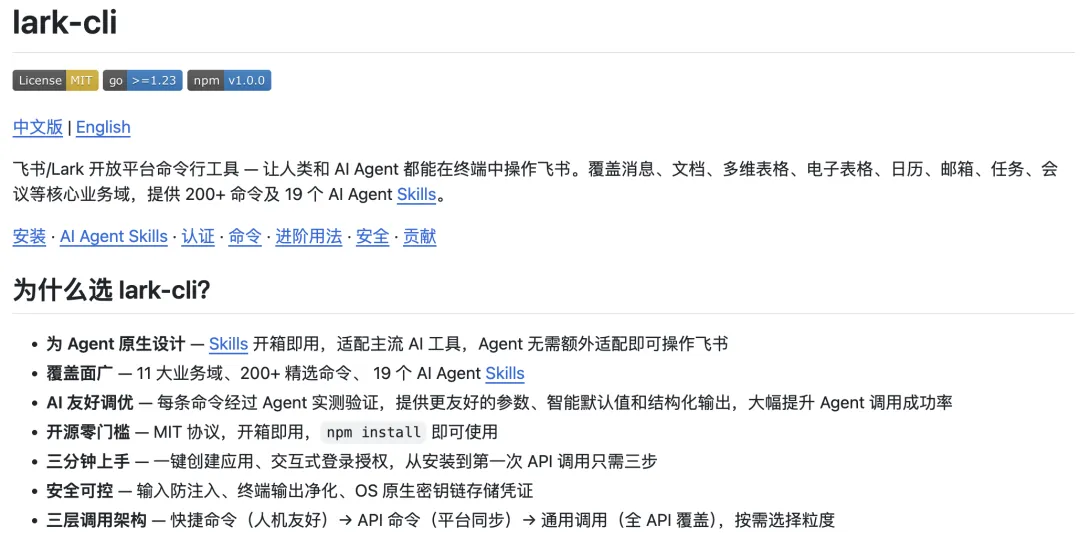 但就在近期,飞书(Lark)正式开源了官方命令行工具 lark-cli (v1.0.0)。