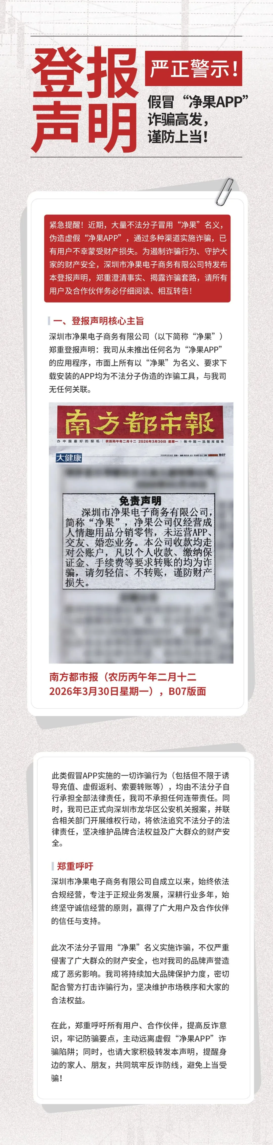 【登报声明】严正警示!假冒“净果APP”诈骗高发,谨防上当!