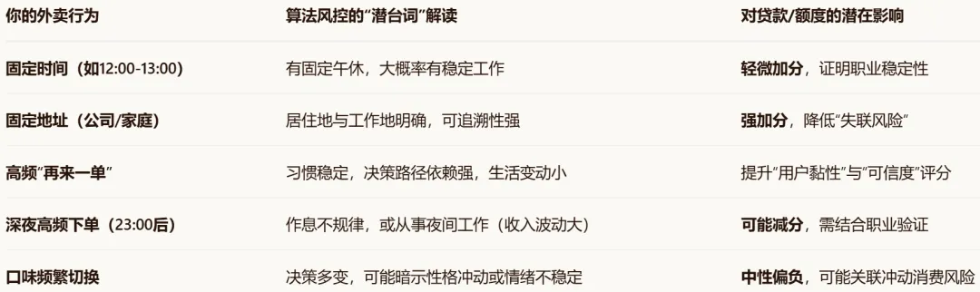 核心结论:外卖数据本身不直接上央行征信,但已成为互联网小贷风控的“侧写”工具。