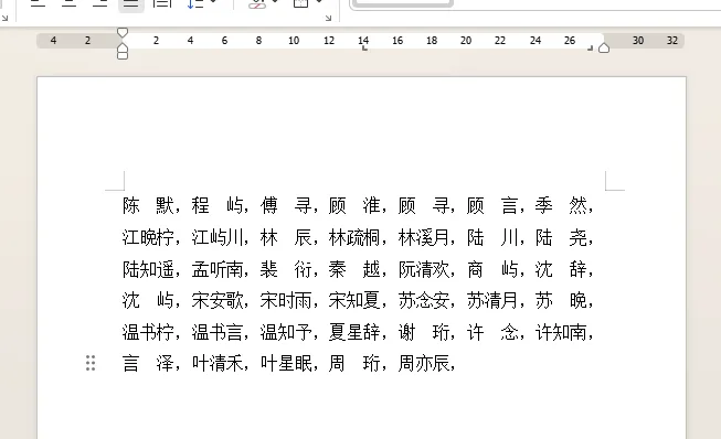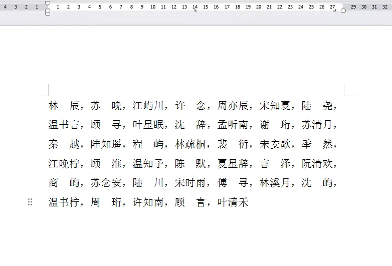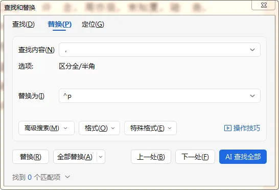 1.按键盘Ctrl+H,弹出查找和替换对话框,在查找内容栏输入逗号(示例姓名之间是用逗号隔开的,所以是逗号),替换为栏输入^p,点击全部替换按钮,每个姓名就将单独占一行。