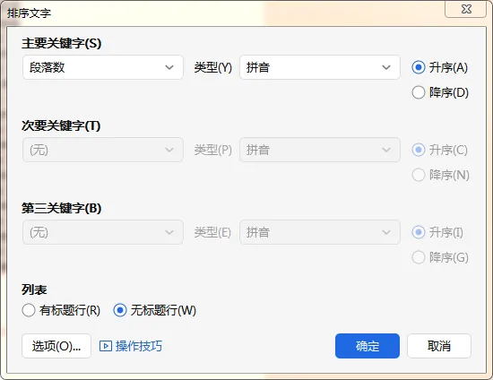 3.在排序文字对话框设置主要关键字为段落数,类型为拼音,勾选升序,点击确定。