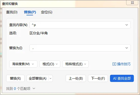 4.按键盘Ctrl+H,弹出查找和替换对话框,在查找内容栏输入^p,替换为栏输入逗号,点击全部替换按钮,完成排序。