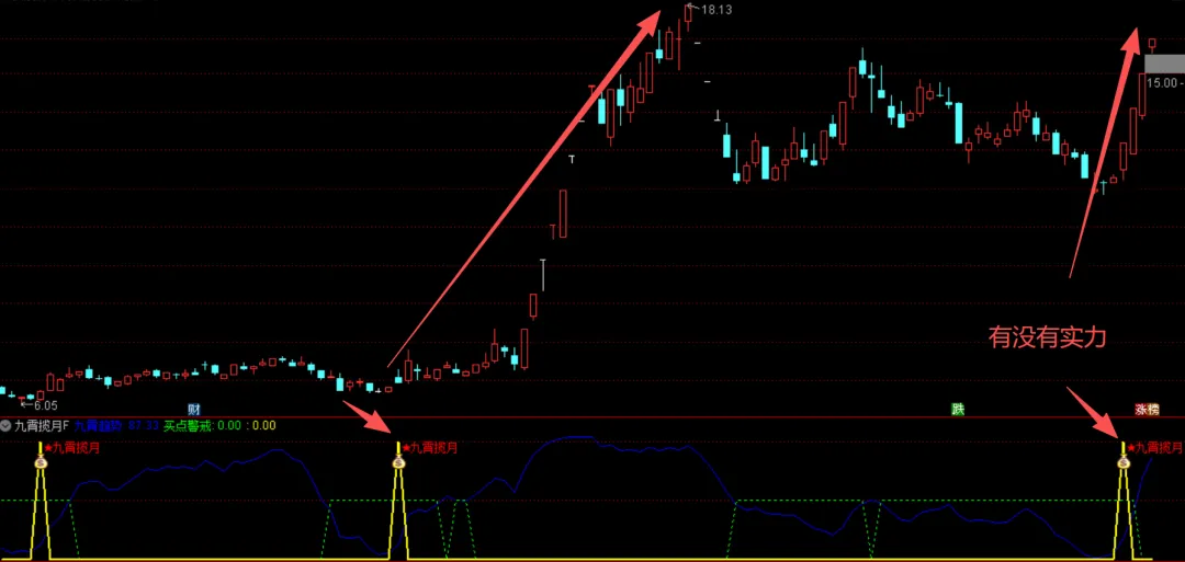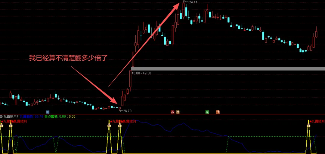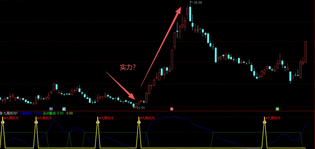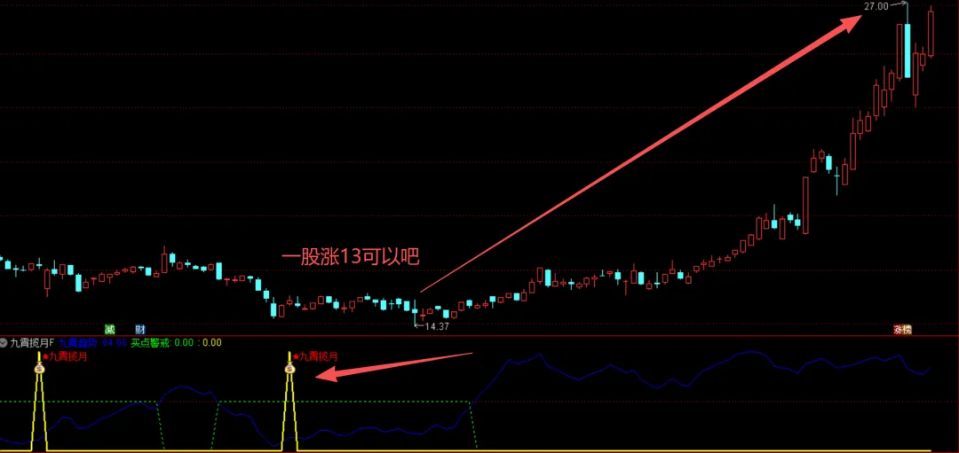 2.副图中的黄色箭头表示九霄揽月信号,也是买点信号,代表价格波动率极低时的超卖临界值。
