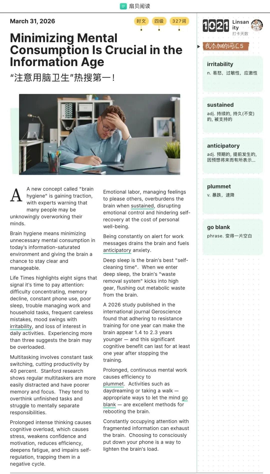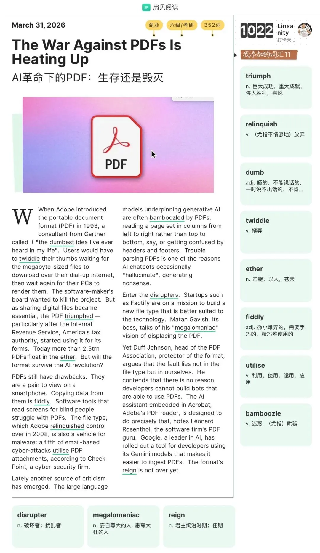 20260331 英语练习:干掉PDF? 每日单词 三月最后一天,2026年已过去四分之一。 短文朗读 (来源:扇贝阅读) PDF格式对于AI来说,确实需要付出额外代价来处理;不过它和docx、xslx一样,都还会在特定的场景下有用。所以干掉PDF格式的想法虽然很诱人,但应该很难发生。 大脑需要休息。我们需要放下手机,放空冥想,给大脑个喘息的机会。这能让你的大脑变年轻。 日拱一卒,功不唐捐;每天一点,进步可见。