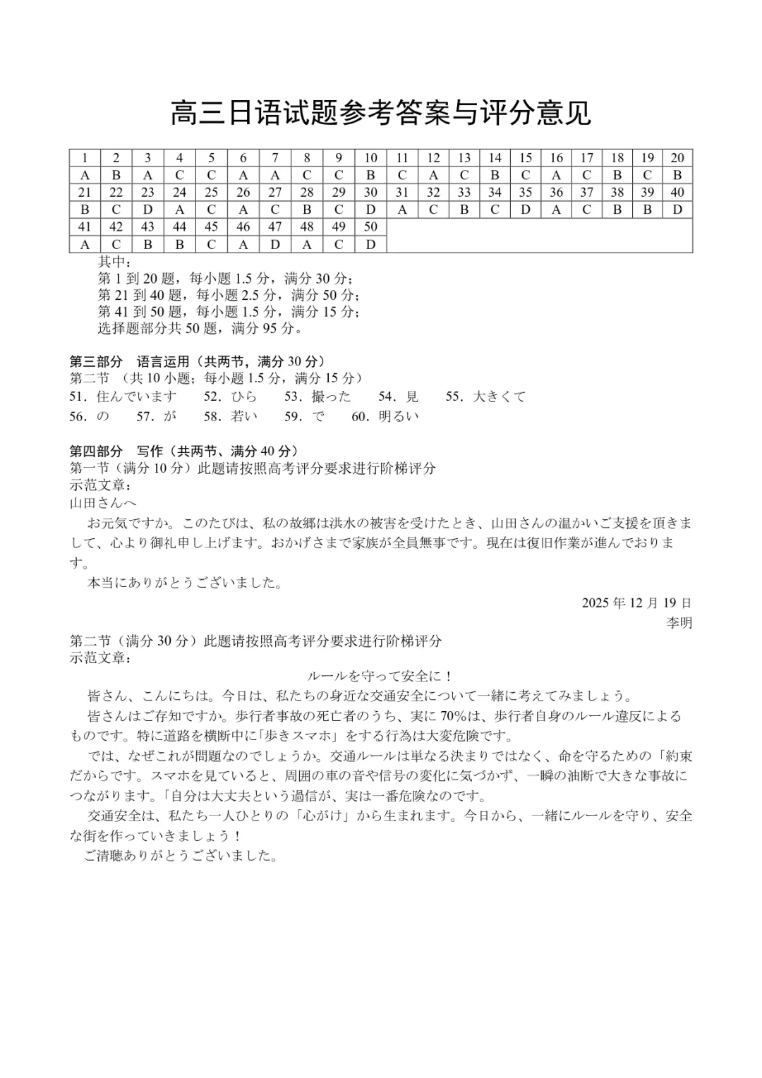 高三日语word/PDF|四川省字节精准教育联盟2026届高三第二次适应性考试日语试卷-作文(感谢信+ルールを守って安全に!)