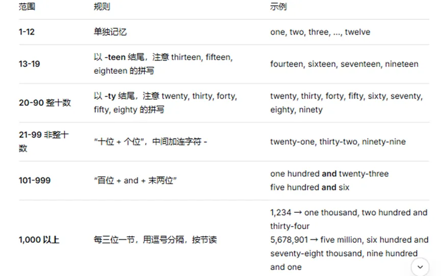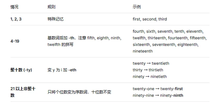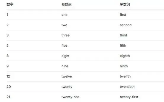 数词是英语语法的基础内容,虽然规则相对简单,但细节和应用的场景很多,熟记基数词和序数词的构成,特别注意拼写易错词(forty, fifth, ninth, twelfth 等)以及主谓一致。